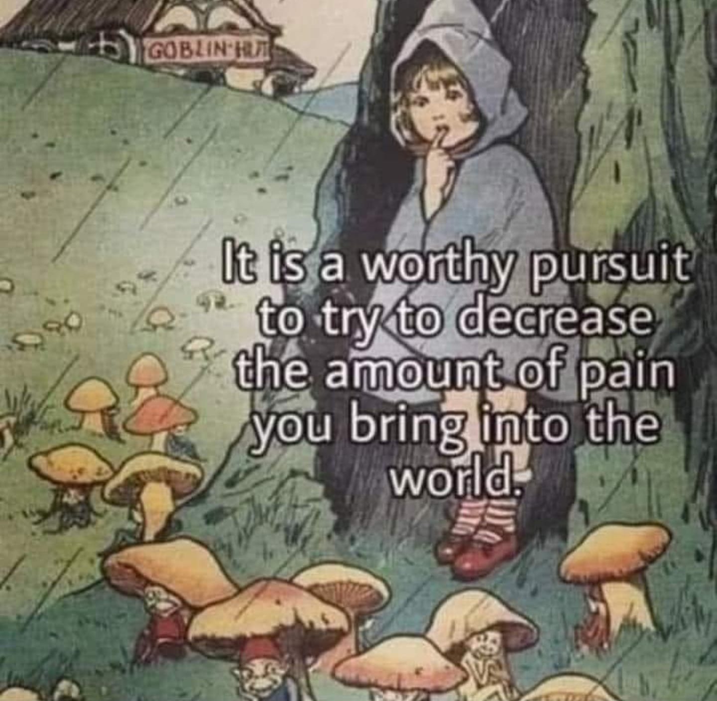 I love the drawing with the little girl outside the "goblin hut," with the goblins hiding under the mushrooms. Love the message, too. I've found myself responding often to things this year, "I'm not interested in creating more suffering, so..." I opt out of certain convos, even if I have lots of 'information,' as I can tell certain folks might spiral into fear or negative spirals if I contributed. This happens in person the most, as I can sense the energetics of the dialogue/people present, but online, a ton, too. Ties into the other "depends on what you feed" meme, too, ie, safegaurd your own consciousness, of course, and also safegaurd the consciousness one's contributing to, as well, out in the world. Thanks for the fabulous curation, Mickey!