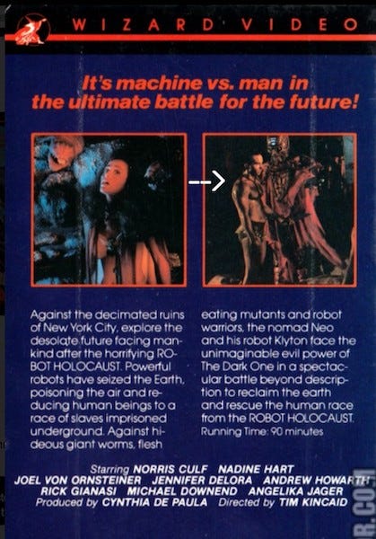 Of course, since those action movie days, I’ve steered my life in many diverse directions. As for Robot Holocaust, for as long as video stores were still a thing, both Fast Eddie and appeared on the VHS box (image above). Eat your heart out, Billy Blanks — but I still want my money (with interest)!
