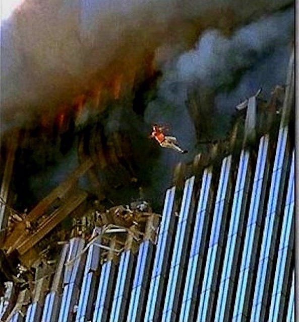Most call them the 9/11 jumpers. Others (strongly) beg to differ. Either way, their descent lasted about ten seconds, at a rate of 125 to 200 MPH. One of them landed on and killed a firefighter named Daniel Suhr — the first of 343 New York Fire Department casualties that day.