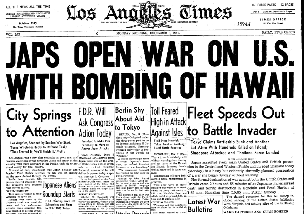 •Dec. 14, 1940: Joseph Grew, U.S. Ambassador to Japan, sends a letter to FDR, announcing, “It seems to me increasingly clear that we are bound to have a showdown [with Japan] someday.”